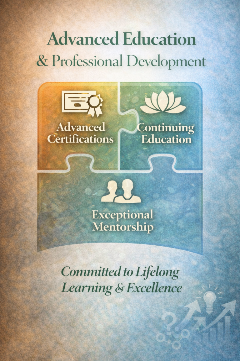 Together, these educational experiences, along with continuing education listed below and the guidance of exceptional mentors throughout my career, created the integrative philosophy that defines my work style — combining therapeutic bodywork, advanced skincare knowledge, and relaxation-centered techniques to support both how you feel and how you look.